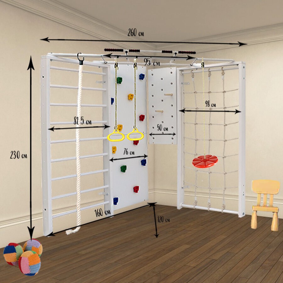 Конструкция шведской стенки пристенная, что позволяет установить ее в любом углу комнаты. Размеры комплекса составляют 1,6 x 2,6 х 2,3 м, а высота - 2,3 м. Общая ширина конструкции с турником составляет 260 см, а ширина захвата турника - 95 см.