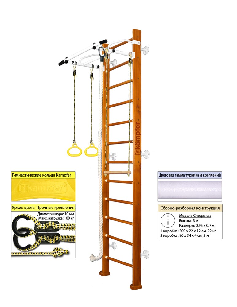 Модель Kampfer Helena включает в себя набор из самых популярных навесных аксессуаров канат, кольца и трапецию. Крепкий металлический турник выдерживает нагрузку до 120 кг, подходит как детям так и взрослым. Навесное оборудование Kampfer на прочных тросах выдерживает нагрузку до 100кг. Особенностью пристенной шведской стенки Kampfer Helena является шесть креплений к стене, в отличие от обычных пристенных моделей, у которых только четыре крепления. Увеличение количества креплений до шести обеспечивает самые надежные и максимально безопасные занятия на ДСК Kampfer.