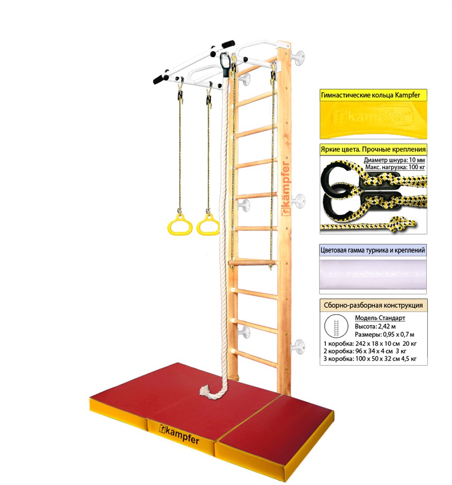 Шведская стенка Kampfer Helena Wall c матом №6 [№1 натуральный Стандарт белый турник c матом №6 красный/желтый]