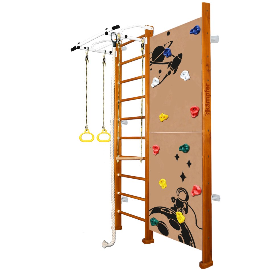 Детский спортивный комплекс ДСК Kampfer Jungle Wall это классическая версия шведской стенки одной из самых популярных моделей из линейки деревянных ДСК Kampfer дополненная скалолазом с новым интересным дизайном для мальчиков. Пристенная шведская стенка Jungle представлена в различной цветовой гамме, что позволяет подобрать нужный оттенок под дизайн помещения.