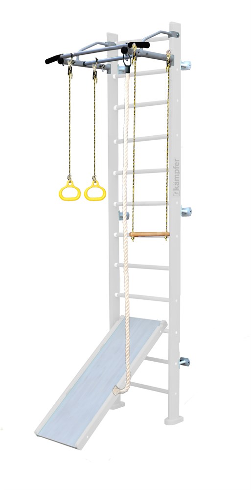 Комплектация Kampfer Ride Wall включает в себя турник, шведскую стенку, канат, гимнастические кольца, трапецию и скат-скалолаз. Это позволяет ребенку заниматься различными видами спорта, развивая при этом силу, ловкость и координацию движений.