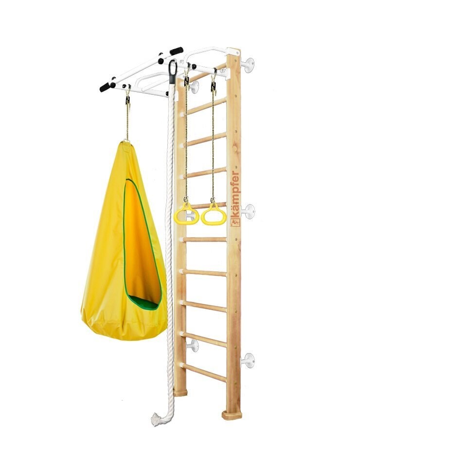 Конструкция шведской стенки Kampfer Shiny Wall включает в себя турник, канат, гимнастические кольца и качели-кокон. Это позволяет вашему ребенку заниматься различными видами упражнений, развивая при этом силу, гибкость и координацию движений.