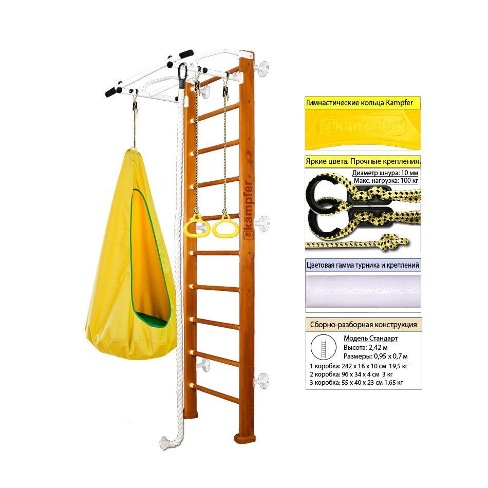 Пристенная шведская стенка Kampfer Shiny Wall включает в себя набор из самых популярных навесных аксессуаров: канат, гимнастические кольца, а также детские качели-кокон для игры и отдыха детей.