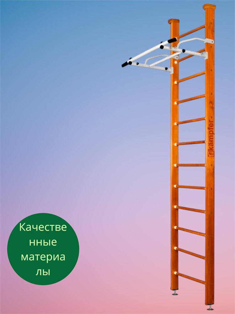 Шведская стенка Kampfer Swedish Ceiling выполнена из дерева, что гарантирует прочность и долговечность конструкции. Турник изготовлен из металла, что обеспечивает его надежность и устойчивость к нагрузкам.