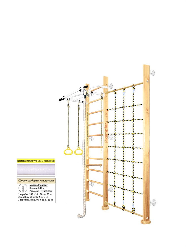 В комплектацию Kampfer Winner Wall входят турник, канат, кольца, трапеция и стойка с сеткой. Турник выдерживает нагрузку до 120 кг, а навесное оборудование - до 100 кг. Стойка с сеткой расширяет игровое пространство и позволяет разнообразить функциональность шведской стенки.