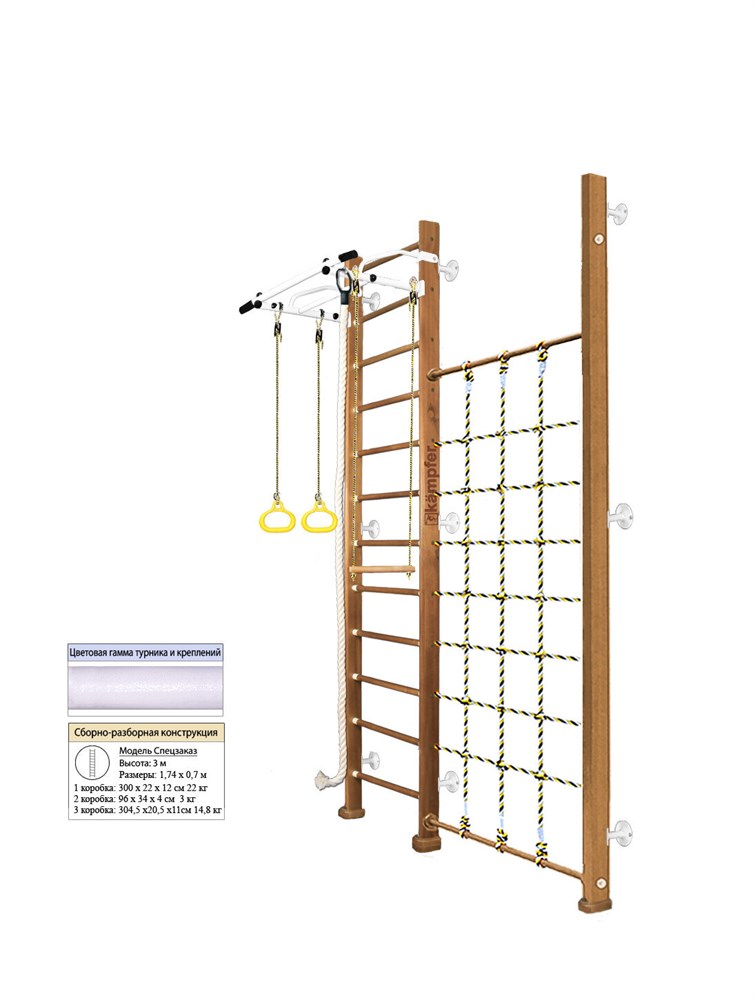 Высота шведской стенки составляет 3 метра, что позволяет использовать ее даже в помещениях с высокими потолками. Общая ширина комплекса составляет 174 см, а ширина захвата турника - 95 см.