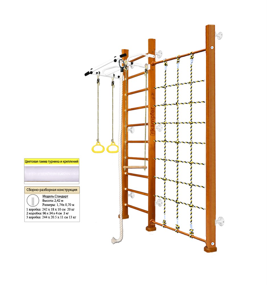 Шведская стенка Kampfer Winner Wall - это домашний спортивный комплекс, который станет отличным выбором для детей и взрослых. Модель Kampfer Winner включает в себя набор из популярных навесных аксессуаров, таких как канат, кольца и трапеция.