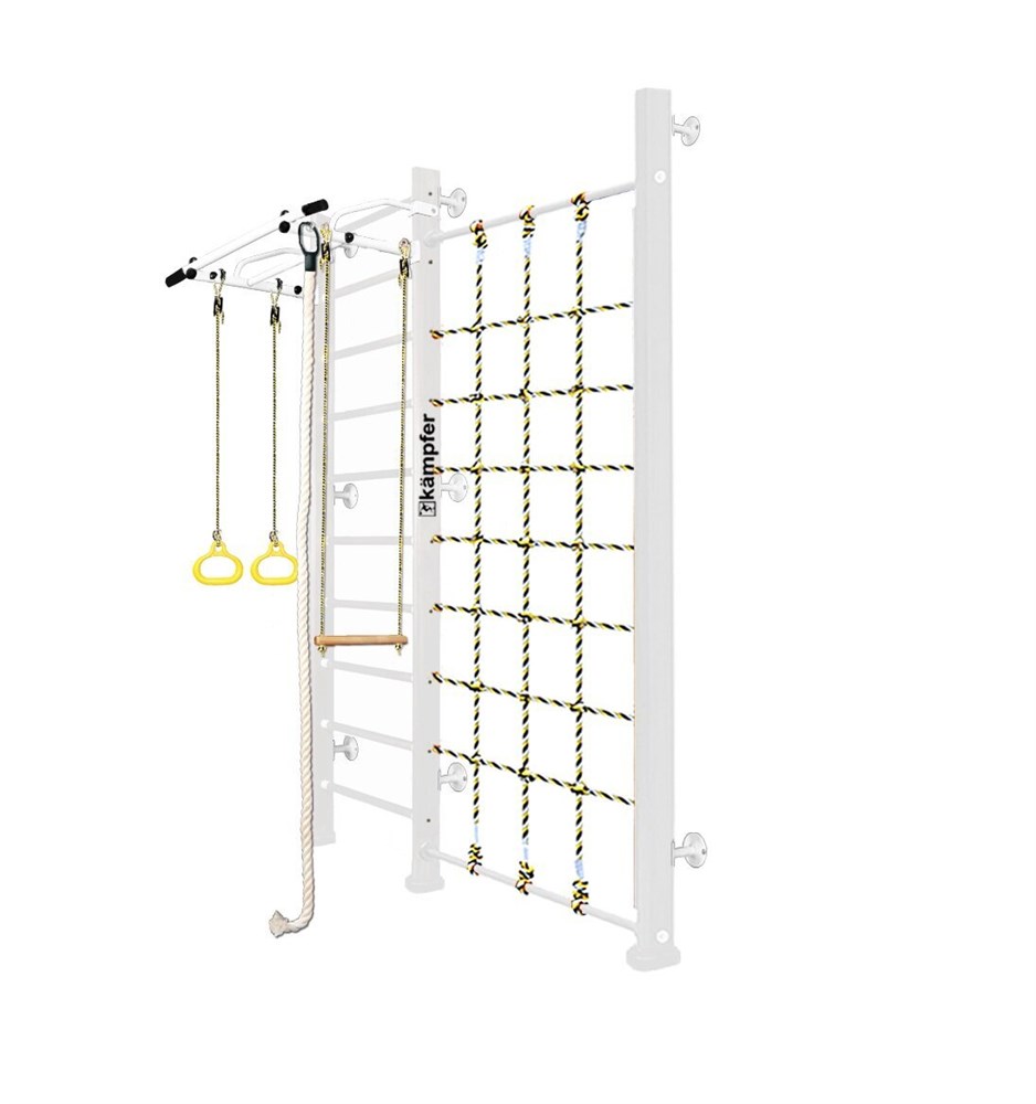 В комплектацию Kampfer Winner Wall входят турник, канат, кольца, трапеция и стойка с сеткой. Турник выдерживает нагрузку до 120 кг, а навесное оборудование - до 100 кг. Стойка с сеткой расширяет игровое пространство и позволяет разнообразить функциональность шведской стенки.