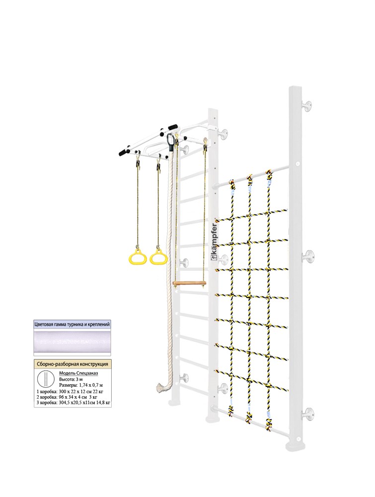 Модель Kampfer Winner включает в себя набор из самых популярных навесных аксессуаров канат, кольца и трапецию. Крепкий металлический турник выдерживает нагрузку до 120 кг, подходит как детям так и взрослым. Навесное оборудование Kampfer на прочных тросах выдерживает нагрузку до 100 кг. В дополнении к основным аксессуарам в комплектации к Kampfer Winner идет канатный лаз - это прочная сетка шириной 90 см из крепкого шнура выдерживает нагрузку до 100 кг. Стойка с сеткой Kampfer Winner значительно расширяет игровое пространство детской комнаты и позволяет разнообразить функциональность классической шведской стенки Kampfer.