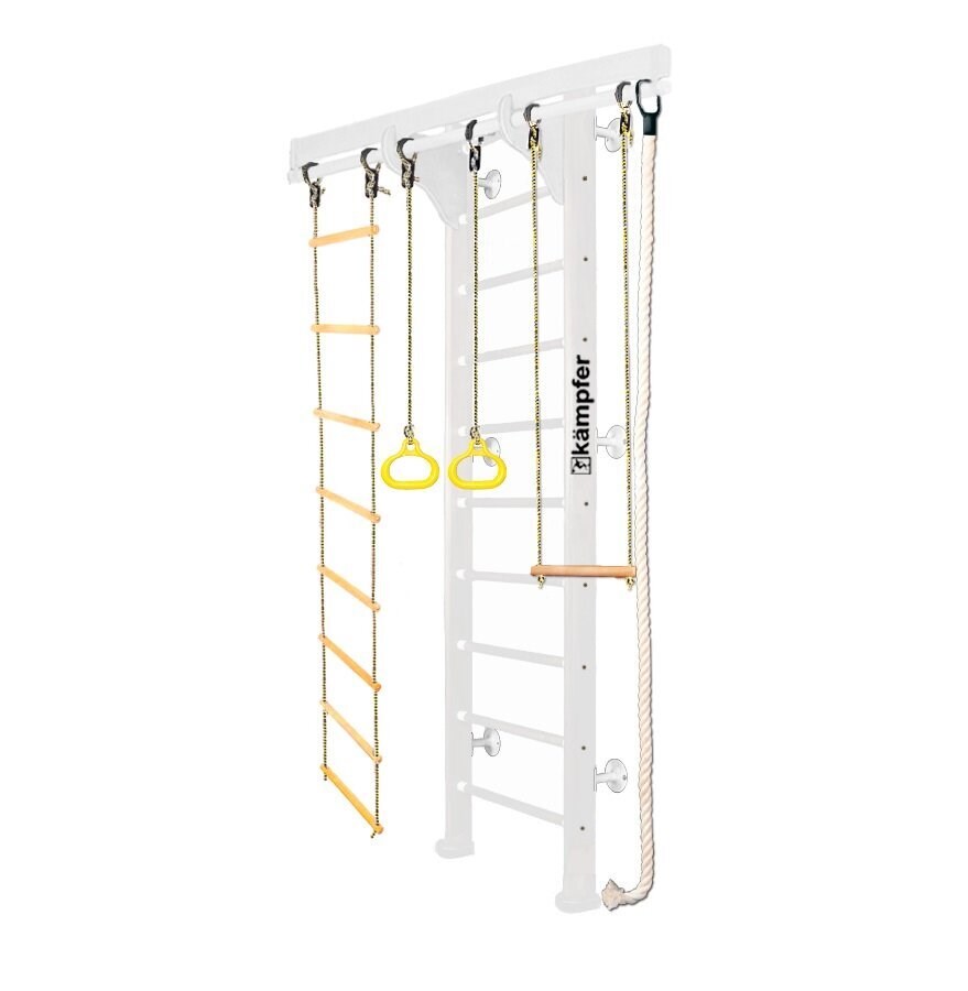 Комплектация шведской стенки включает в себя канат, кольца, верёвочную лестницу и трапецию. Это позволяет ребенку заниматься спортом и играть в различные игры, развивая при этом свои физические навыки и координацию движений.