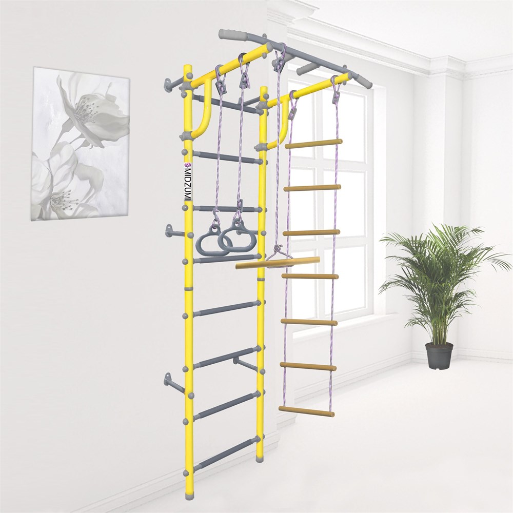 Домашний спортивный комплекс Midzumi Banji Kabe подарит ребенку возможность полюбить спорт, расти здоровыми и уверенными в себе личностями. Организуйте спортивный уголок с помощью универсальной и малогабаритной шведской стенки, которая оснащена веревочной лестницей, тарзанкой и гимнастическими кольцами.