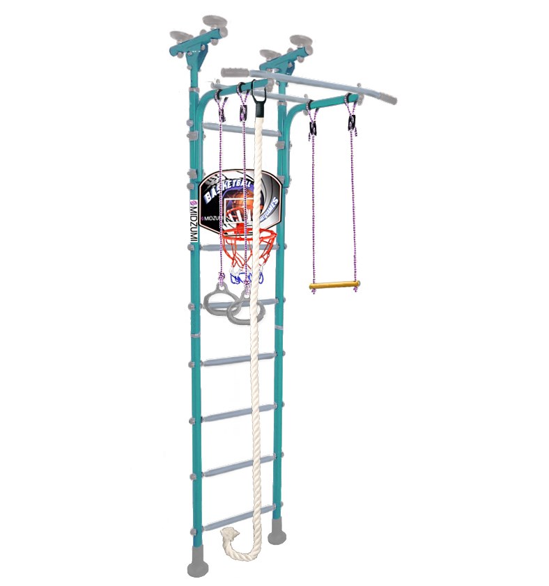 Комплектация: основа - металлическая шведская стенка с турником, трапеция, канат, гимнастические кольца, баскетбольный щит с мячом