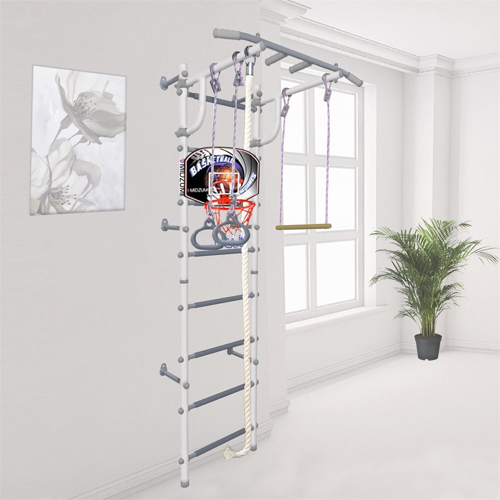 Комплектация: основа - металлическая шведская стенка с турником, гимнастические кольца, канат, трапеция, баскетбольный щит с мячом