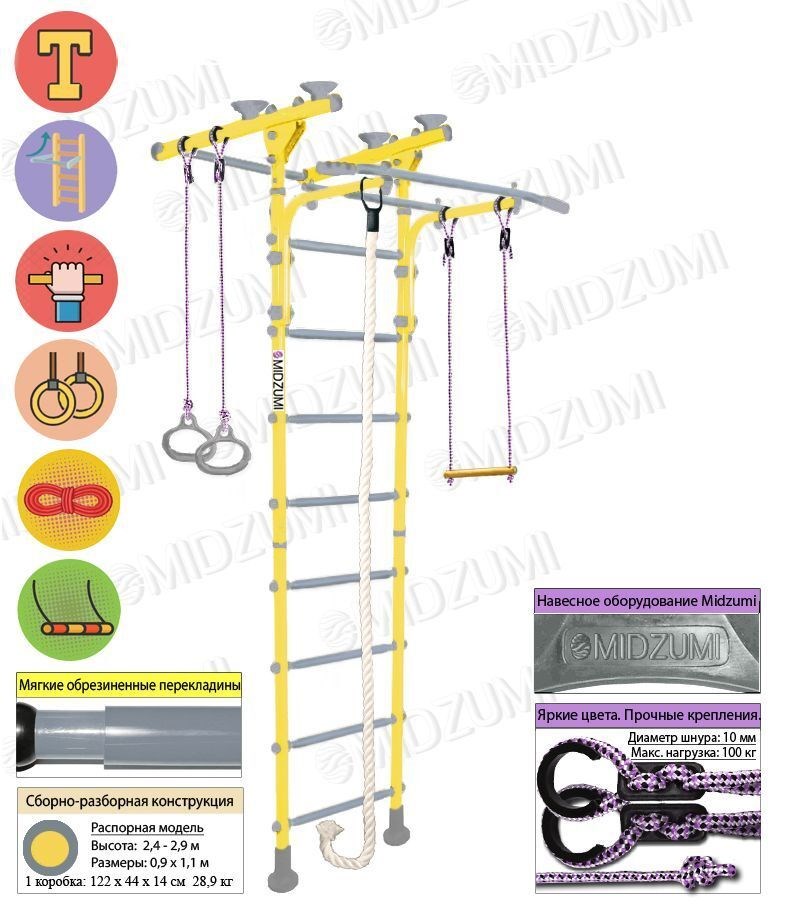 — Комплектация: гимнастические кольца, канат, веревочная лестница, брусья откидные
