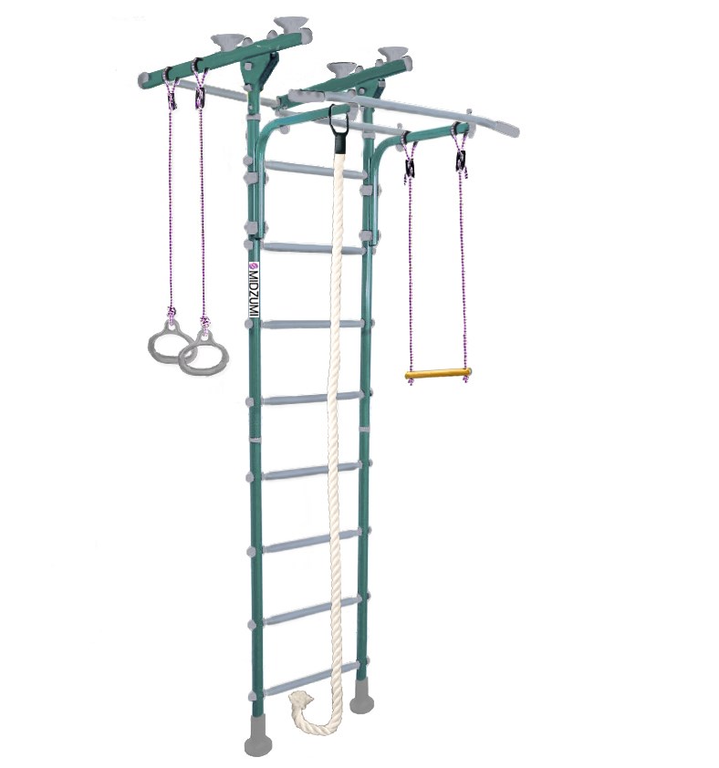 Необузданная детская энергия найдет выход на широкоформатном спортивном комплексе Hoshi Ton. Стенка этого комплекса не крепится к стене, а ставится враспор между потолком и полом, создавая игровое пространство с двух сторон, при этом, не занимая много места в комнате. Такой комплекс станет украшением детской комнаты и принесут много радости детям, разовьют у них координацию движения, сделают их здоровыми, спортивными, к тому же займут их досуг. Комплектация: основа - металлическая Т - образная шведская стенка, гимнастические кольца, канат, трапеция.