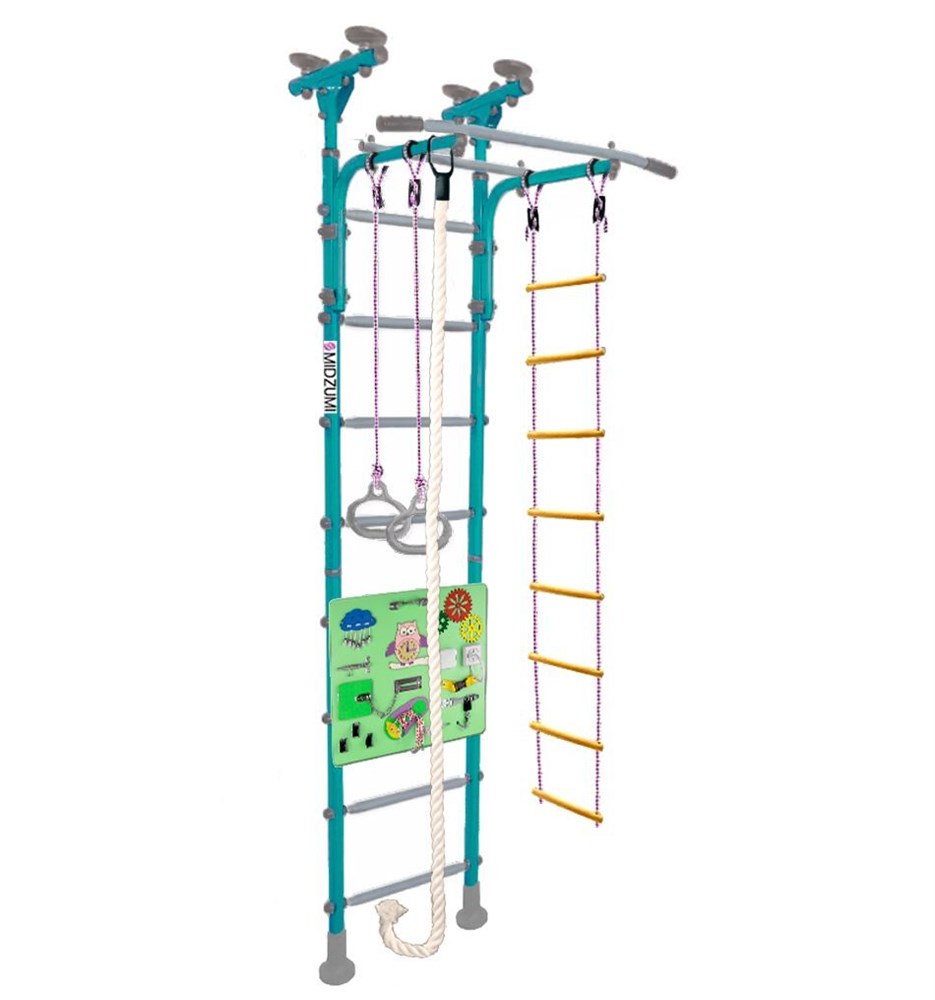 Компактная шведская стенка Midzumi Niji Busyboard станет частью интерьера даже небольшой квартиры: она занимает не более одного квадратного метра и при этом функциональна: в комплекте имеются гимнастические кольца, канат, веревочная лестница и бизиборд Midzumi Busyboard Sovushka (умная доска). Настоящий комплекс 4-в-1, который будет интересен и малышам до двух лет, и детям постарше.Все элементы заинтересуют ребенка и позволят приучить его к занятиям спортом с ранних лет, а уникальная в своем роде умная доска бизиборд поможет самым юным и любопытным спортсменам освоиться в мире всевозможных разноцветных предметов (дверных ручек, замков, розеток, гаек с болтами и выключателей) на 800% быстрее. Закрепить бизиборд можно на той высоте, которая будет удобна ребенку. Данная игрушка разработана специалистами кафедры акмеологии и кибернетики при участии педагогов и абсолютно безопасна для детей.— Крепление враспор между полом и потолком удобно тем, что подходит для любых стен, и комплекс можно передвигать с места на место.Но потолок не должен быть из хрупких материалов, таких как гипсокартон (навесные) и вагонка, для них лучше подойдут пристенные модели.Комплектация: основа - металлическая шведская стенка с турником, гимнастические кольца, канат, веревочная лестница, бизиборд