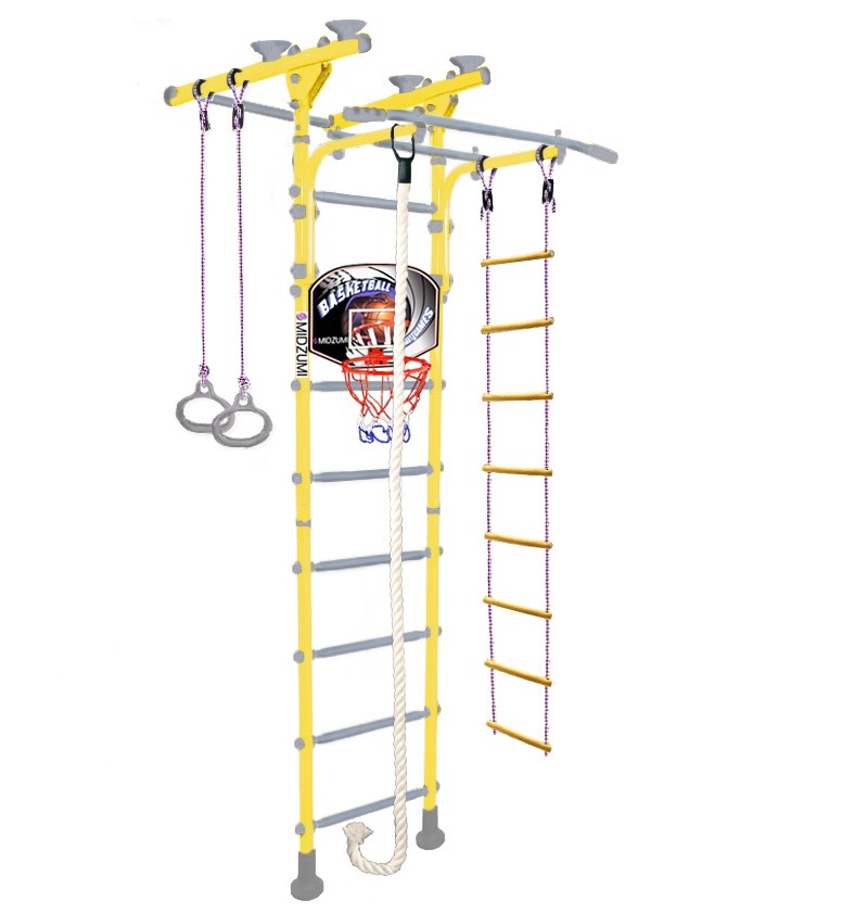Комплектация: основа - металлическая Т - образная шведская стенка с турником, гимнастические кольца, канат, веревочная лестница, баскетбольный щит с мячом