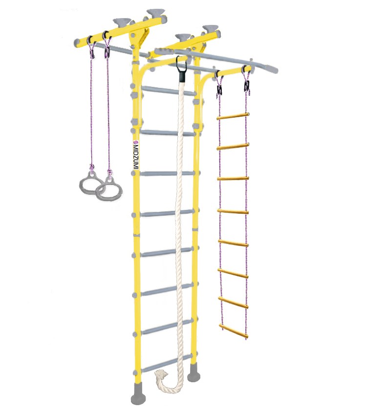 Необузданная детская энергия найдет выход на широкоформатном спортивном комплексе Niji Ton. Стенка этого комплекса не крепится к стене, а ставится враспор между потолком и полом, создавая игровое пространство с двух сторон, при этом, не занимая много места в комнате. Такой комплекс станет украшением детской комнаты и принесут много радости детям, разовьют у них координацию движения, сделают их здоровыми, спортивными, к тому же займут их досуг.