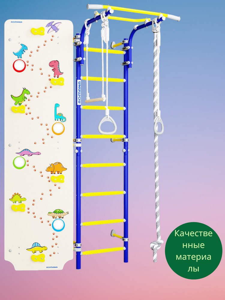 Комплектация: шведская стенка, турник подвижный, Скалолаз, канат, трапеция, кольца.