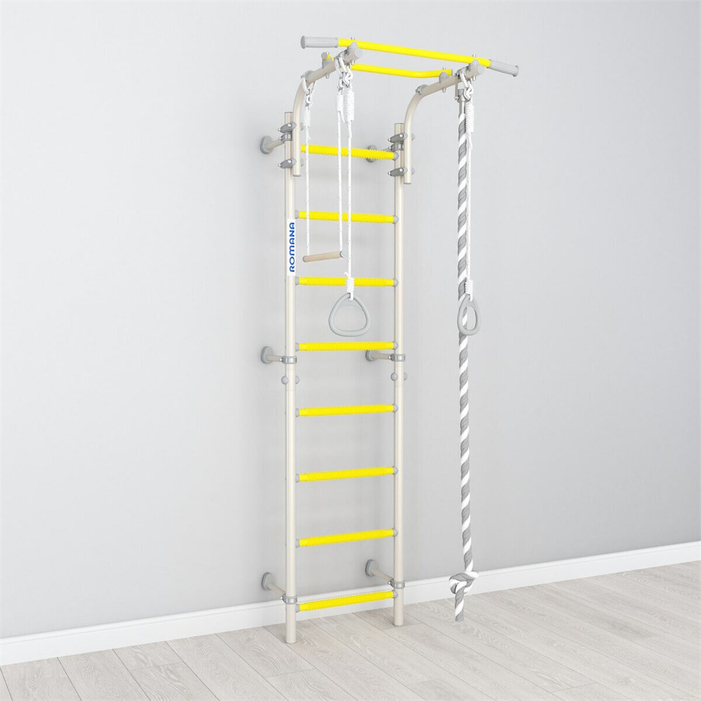 В комплектацию шведской стенки входят массажные ступени, которые способствуют развитию мелкой моторики и обеспечивают крепкий хват рук. Кроме того, в комплект входят гимнастические кольца, трапеция и канат, на которых можно висеть и лазить.