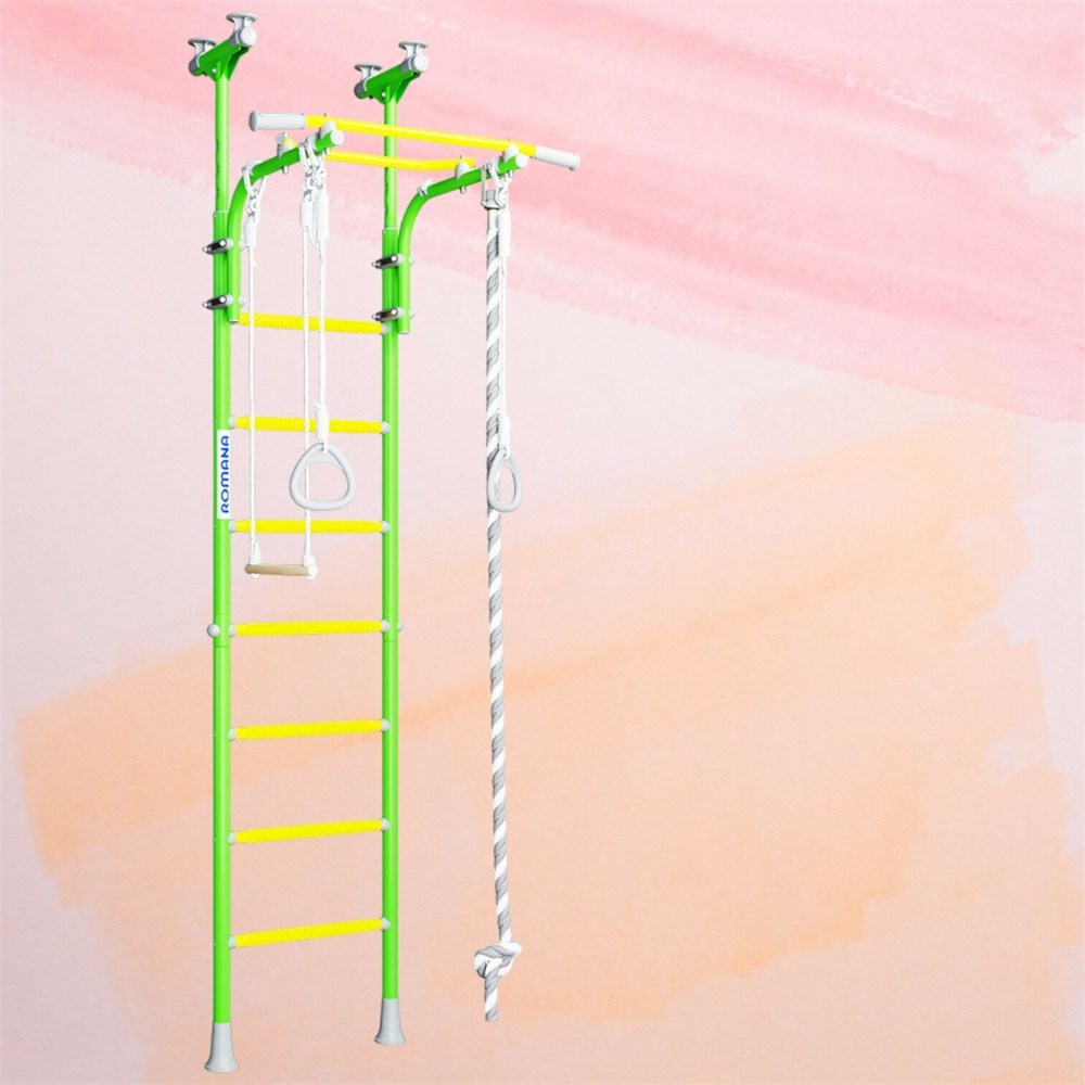 Шведская стенка ROMANA R5 Kometa выполнена в зеленом цвете с желтыми элементами, что делает ее яркой и привлекательной.