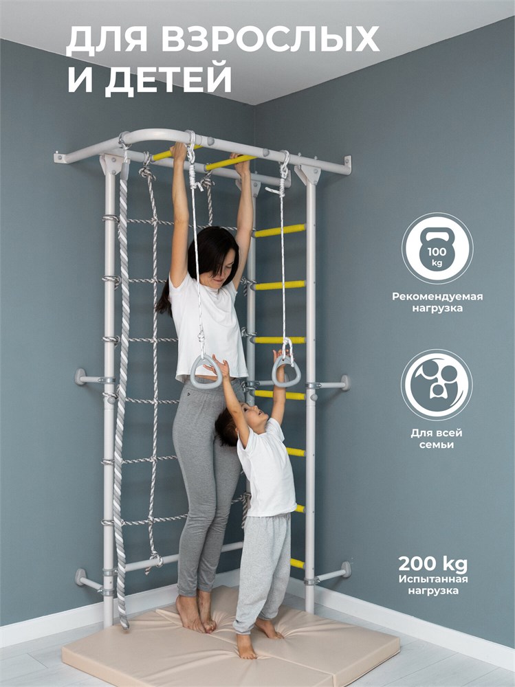 В комплекте с шведской стенкой идут канат, кольца, сетка для лазания. Максимальная нагрузка на навесное оборудование составляет 50 кг.