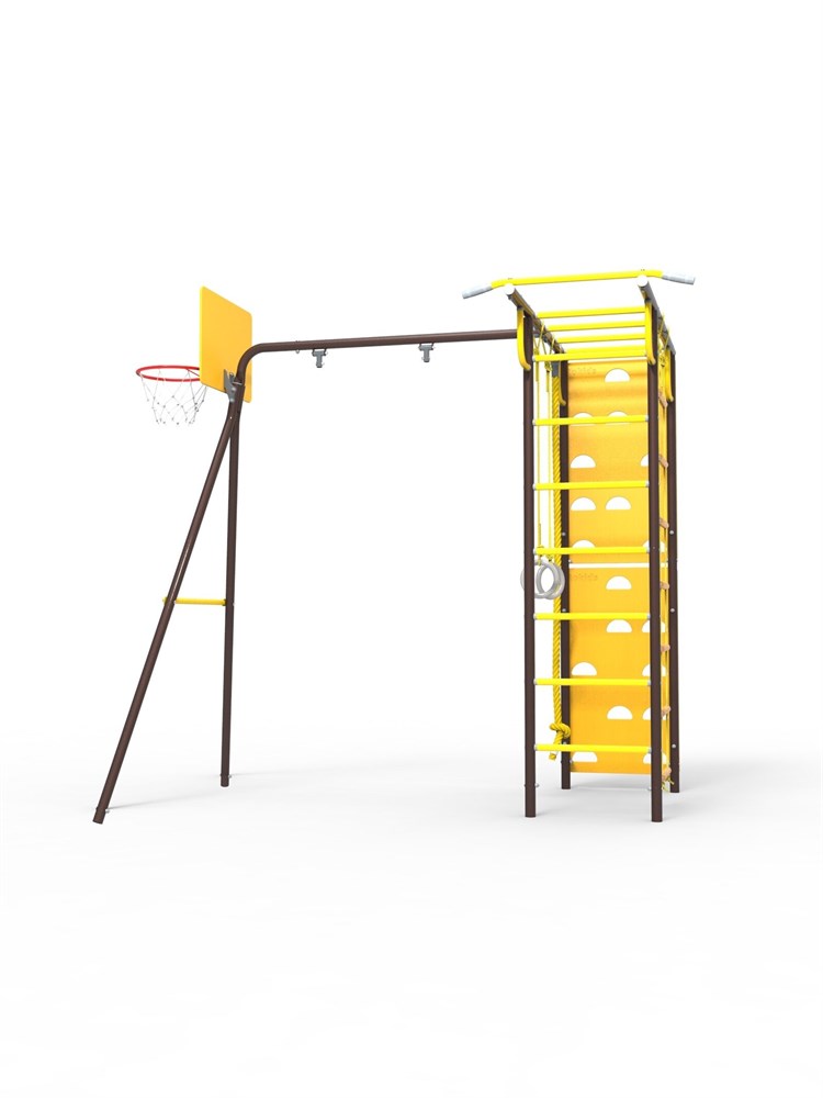 В комплектацию УДСК-6.1 Rokids "Тарзан Мини" входит: рукоход, кольца гимнастические, канат, кольцо баскетбольное, лестница веревочная, турник, скалодром, подшипниковые опоры для качели, ступени ПВХ.