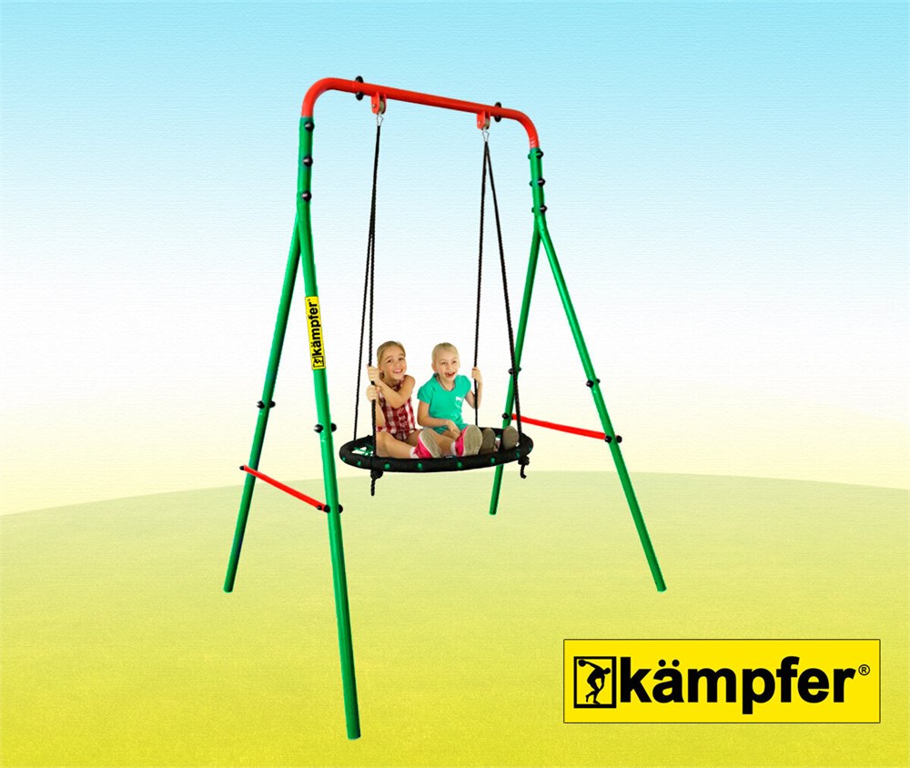 Конструкция Kampfer Wippe представляет собой две А-образных опоры из 2-х металлических стоек, соединенных между собой перекладиной для навесного оборудования - с креплениями для качелей "гнездо". Дети с удовольствием играют на этом детском спортивном уголке часами, при этом укрепляются мышцы, развивается ловкость и физическое здоровье малышей.